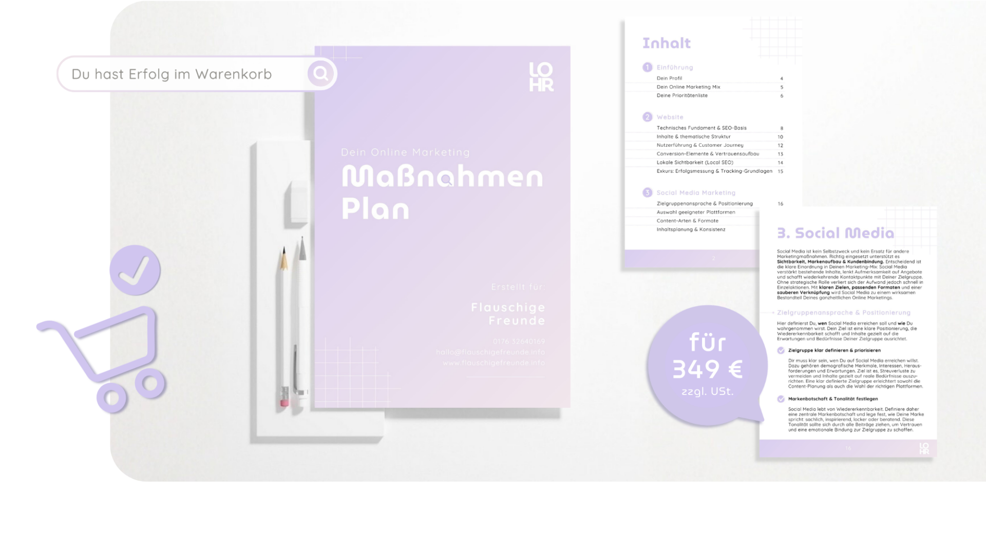 Der Online Marketing Maßnahmenplan kostet einmalig 349 € zzgl. USt. Du erhältst ein individuell ausgearbeitetes PDF-Dokument auf Basis Deiner Angaben, inklusive priorisierter Online Marketing Maßnahmen und klarer Empfehlungen. Es gibt keine laufenden Kosten, Abos oder versteckten Zusatzgebühren. Wenn Du Hilfe brauchst, kannst Du natürlich jederzeit die Beratung oder Umsetzung von LOHR dazubuchen.